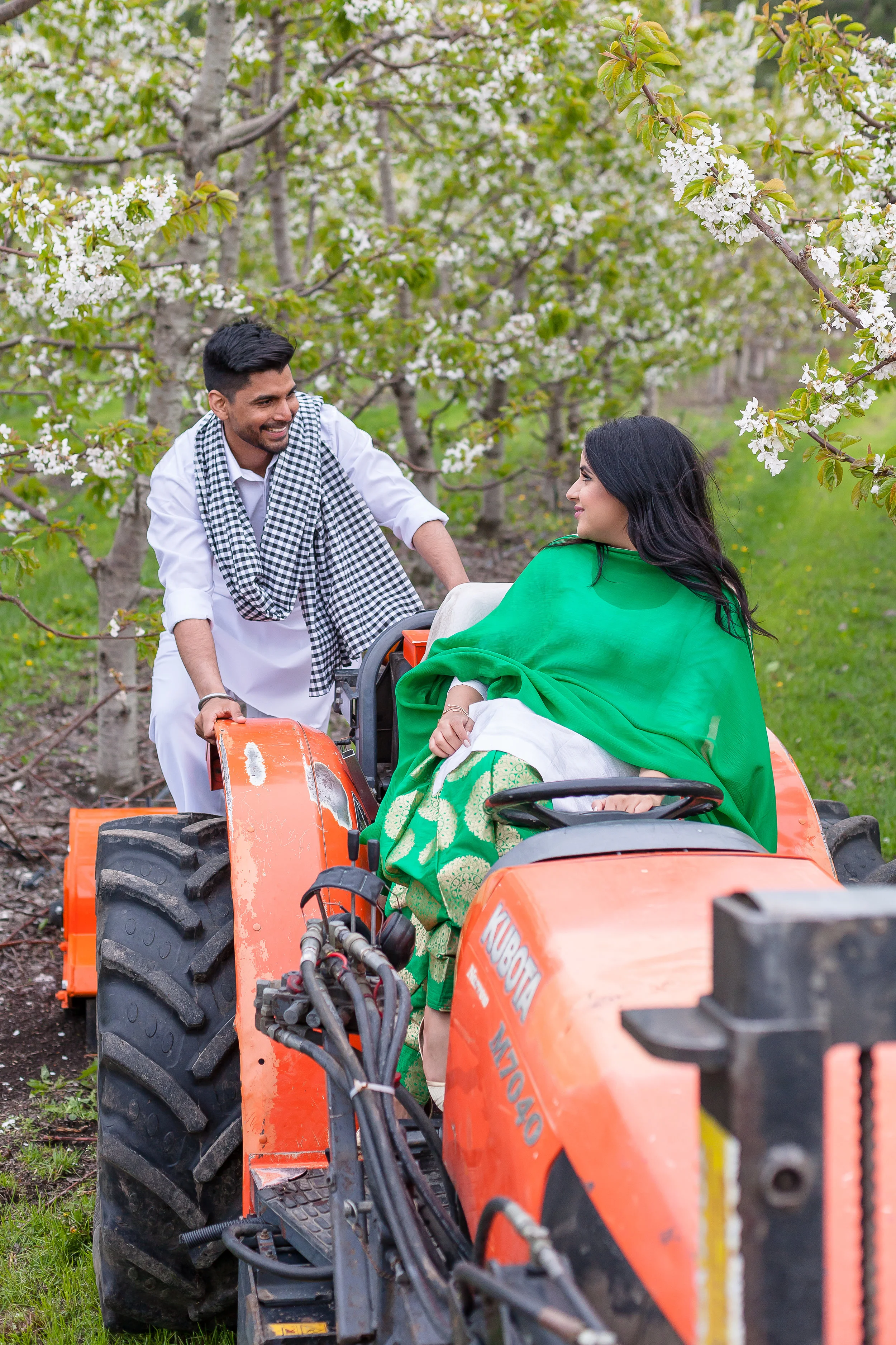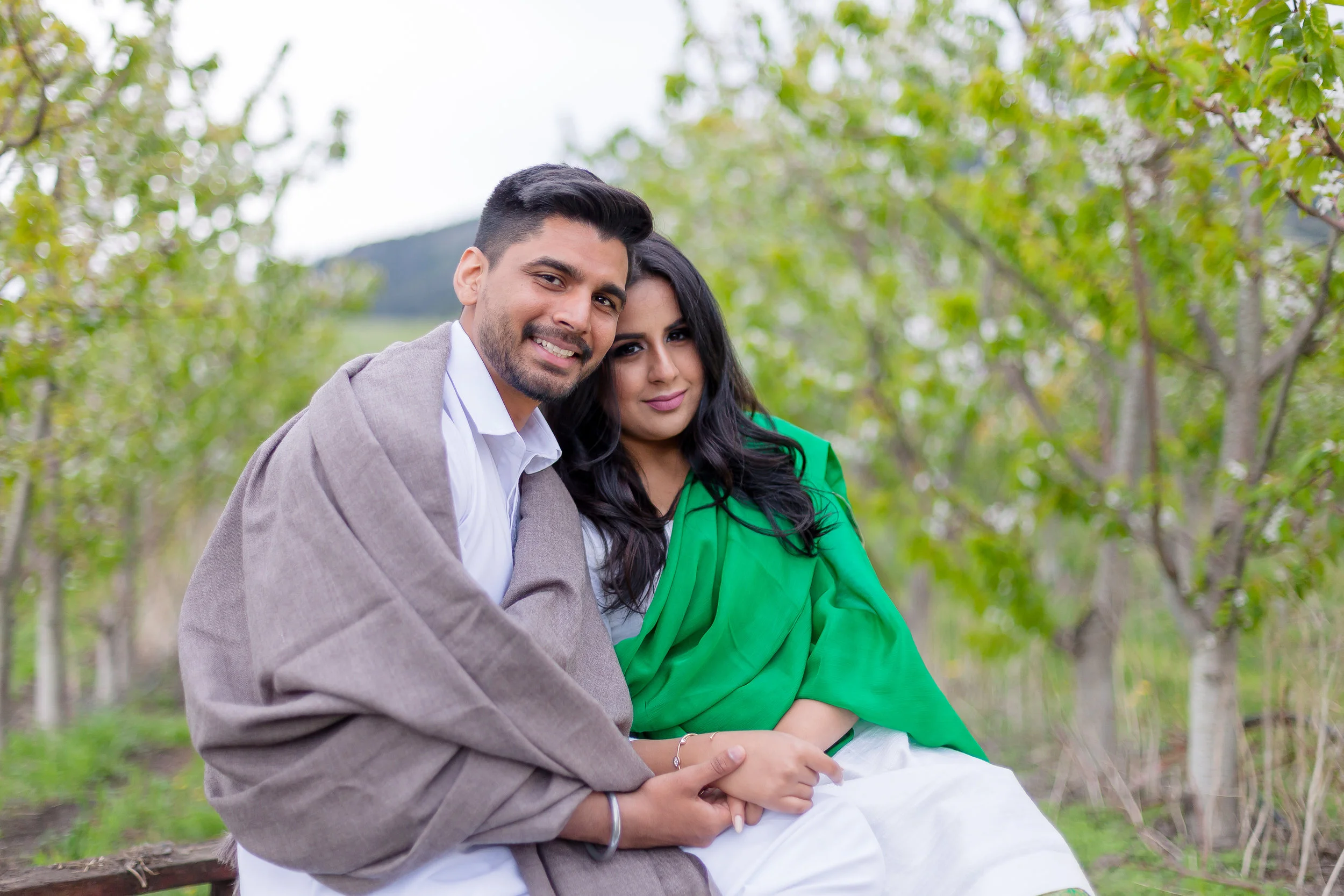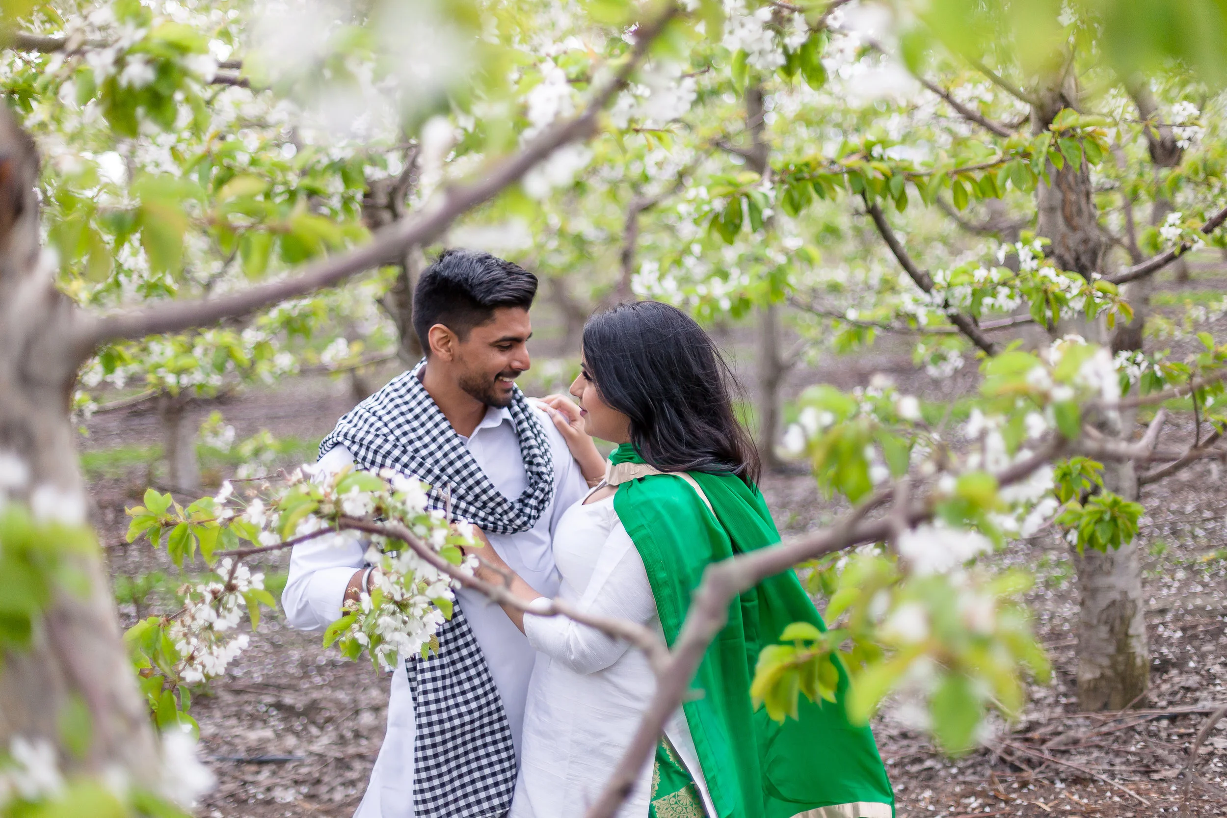 Once we wrapped up, we started making our way up the orchard. This was shoot #2 of my spring orchard sessions. This time, I wasn't the only person who lived on this beautiful piece of property. Dalraj grew up amongst the cherry and apple trees and this was a special place for her too. She lived up the street and across the rows upon rows of trees from me. Neighbours in fact, although I would have to say we were a little too far from each other to borrow a cup of sugar. Ideally we were hoping to get that perfect sunset for the last part of our session, but as luck would have it the clouds rolled in. We may not have had the golden sunset we had hoped for, but the clouds created the most perfect overcast and beautiful light to finish off the day. Dalraj and Jaz literally rolled into the orchard in Jaz's Mustang. Once they got out I was completely floored. The traditional Indian clothing they were wearing was phenomenal! Dalraj was wearing the most brilliant emerald green Salwar Kameez, and Jaz wore a crisp white Kurta.