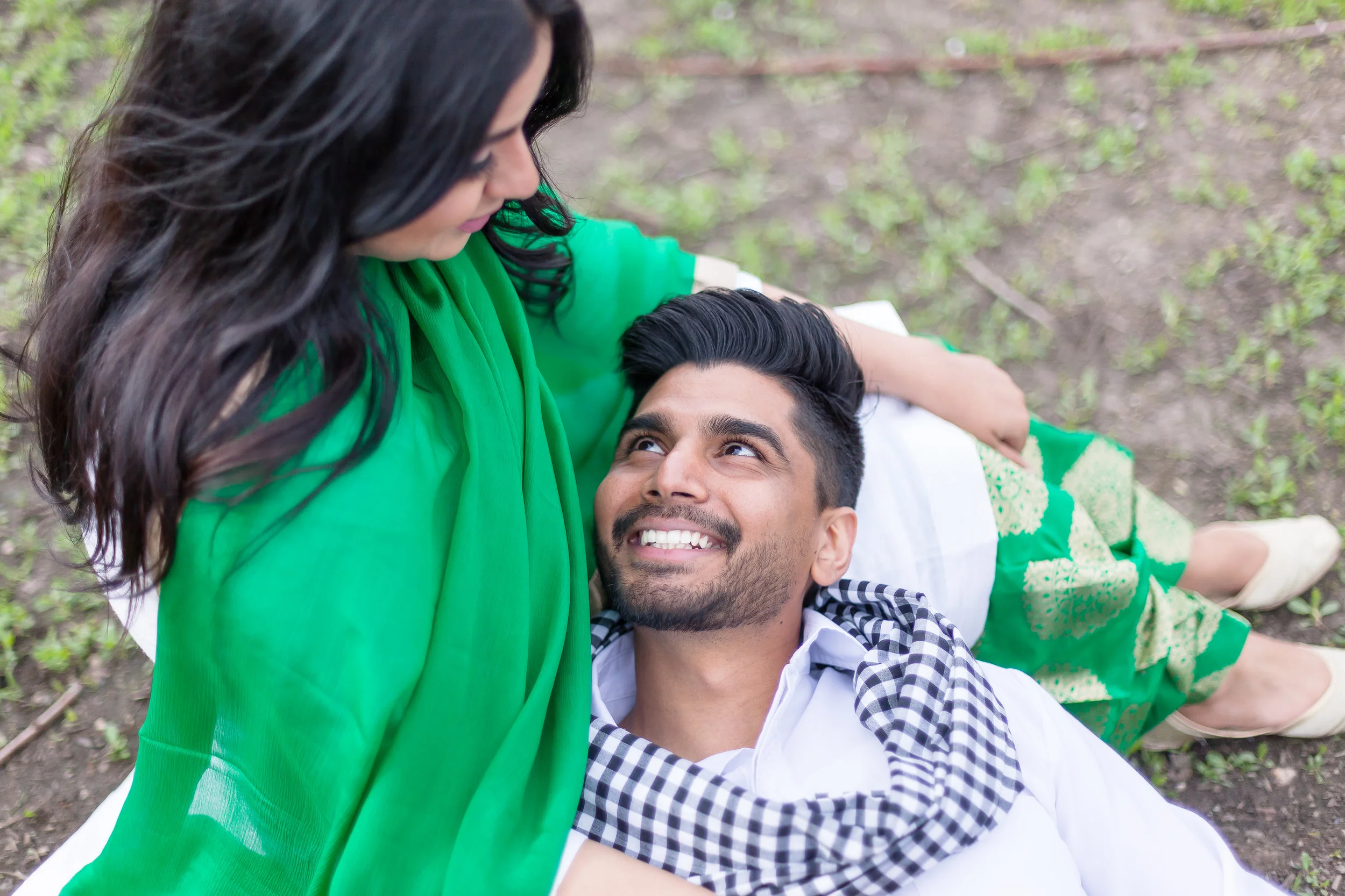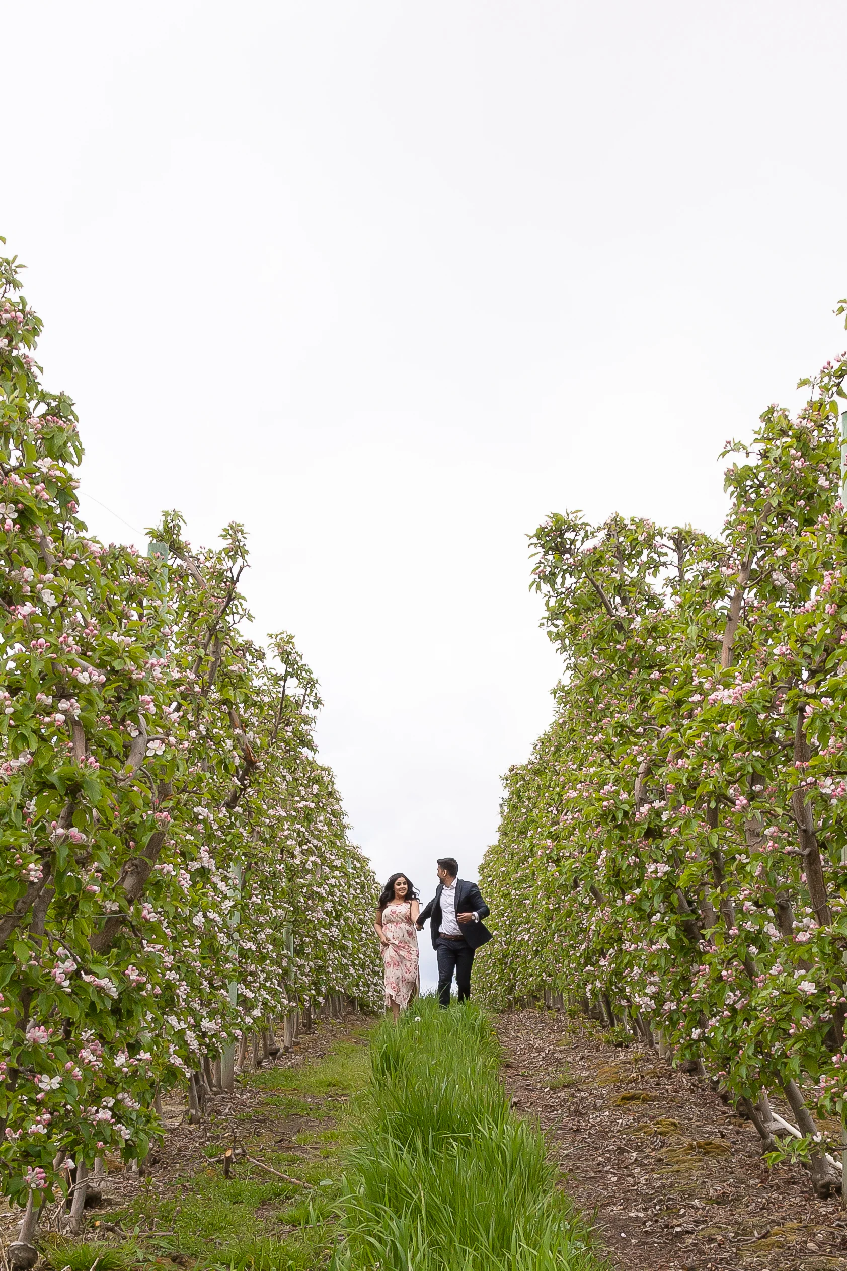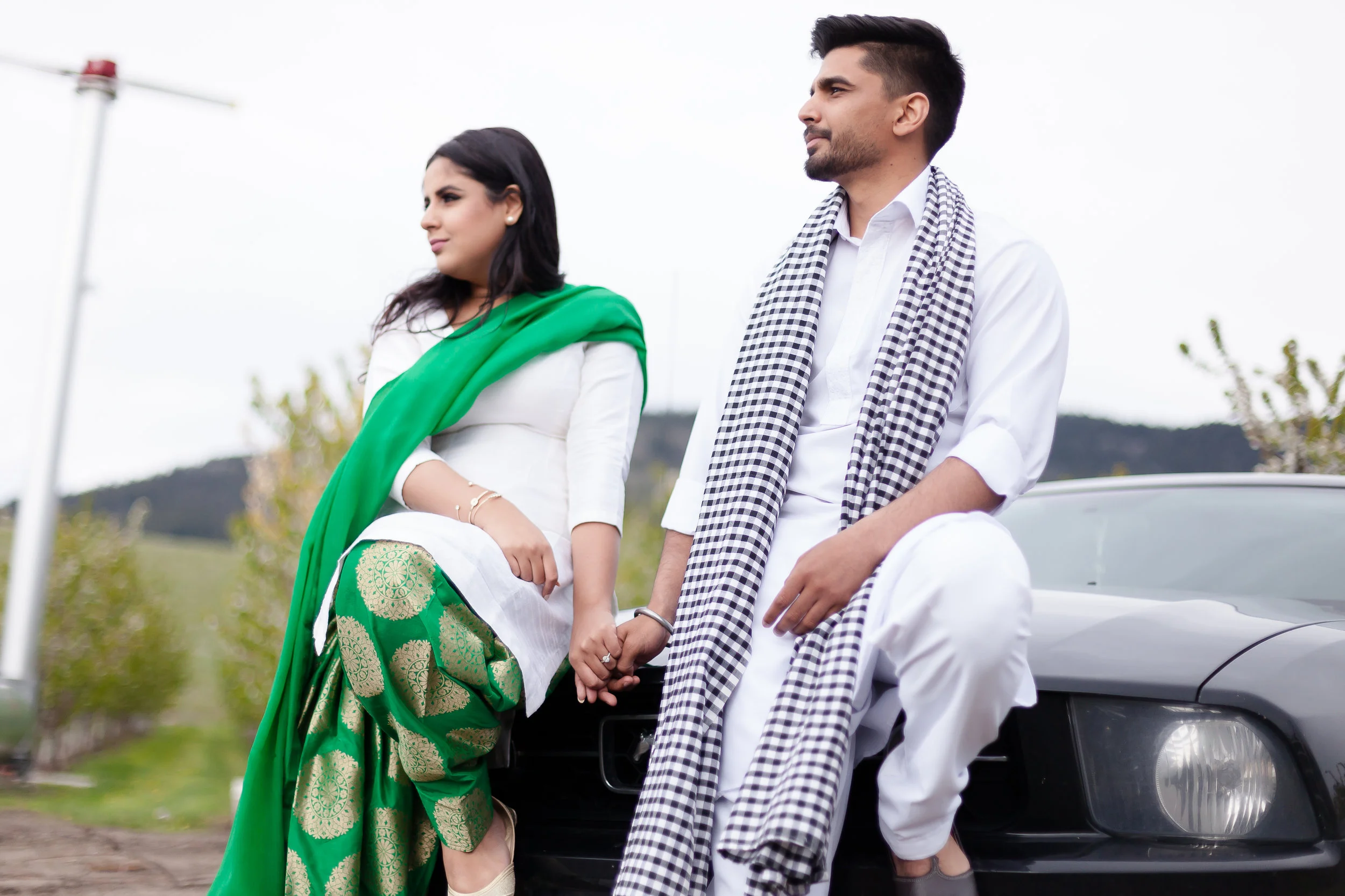 Once we wrapped up, we started making our way up the orchard. This was shoot #2 of my spring orchard sessions. This time, I wasn't the only person who lived on this beautiful piece of property. Dalraj grew up amongst the cherry and apple trees and this was a special place for her too. She lived up the street and across the rows upon rows of trees from me. Neighbours in fact, although I would have to say we were a little too far from each other to borrow a cup of sugar. Ideally we were hoping to get that perfect sunset for the last part of our session, but as luck would have it the clouds rolled in. We may not have had the golden sunset we had hoped for, but the clouds created the most perfect overcast and beautiful light to finish off the day. Dalraj and Jaz literally rolled into the orchard in Jaz's Mustang. Once they got out I was completely floored. The traditional Indian clothing they were wearing was phenomenal! Dalraj was wearing the most brilliant emerald green Salwar Kameez, and Jaz wore a crisp white Kurta.